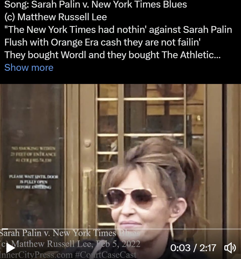 SDNY COURTHOUSE, April 14 – The Friday before the second round of Sarah Palin versus New York Times, a final pre-trial conference was held by U.S. District Court for the Southern District of New York Judge Jed S. Rakoff. Inner City Press, which covered the first trial, live tweeted it, thread.