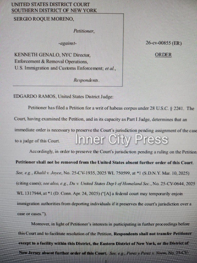 The case was assigned to White Plains-based Judge Kenneth M. Karas, who sent a February 3 conference - at which it emerged the petitioner, Sergio Roque Moreno, had signed for voluntary removal and left. Judge Karas was troubled and is moving toward an evidentiary hearing. Inner City Press live tweeted:
